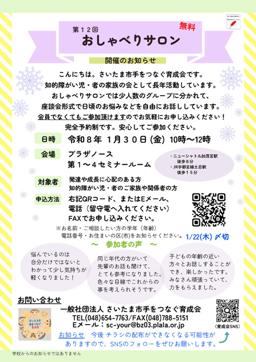 日時:令和8年1月30日(金) 場所:プラザノース 第1~4セミナールーム 対象者:発達や成長に心配のある方 知的障がい児・者のご家族や関係者 参加費用:無料 お問い合わせはチラシ掲載のQRコード、メール、電話、FAX メール(sc-your@bz03.plala.or.jp) 電話 048-654-7763 FAX 048-788-5151 WEB申込はこちらから→ ●皆様のご参加をお待ちしています。 詳細(チラシPDF)はこちらから→